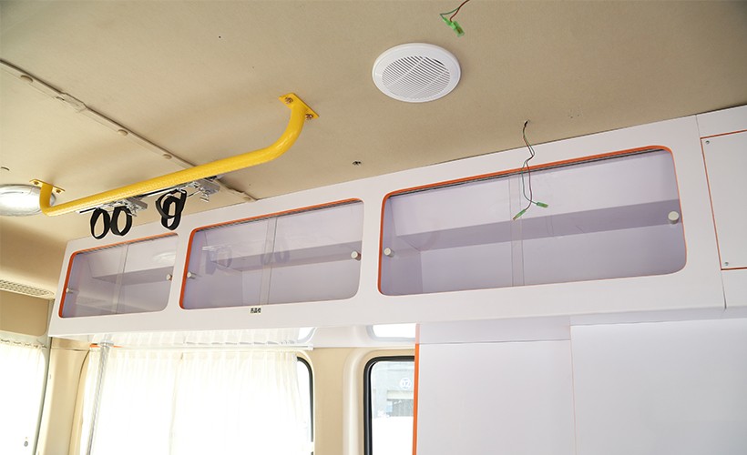 6、医疗舱顶部安装有排气扇,有效地将负压隔离舱过滤后的气体排出车外,保证舱内空气清洁。