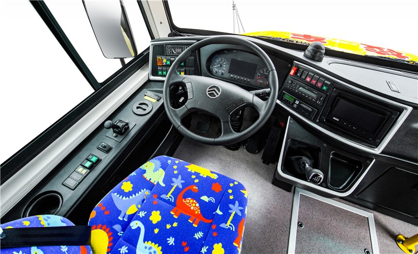该车外观借鉴欧美校车风格,是严格按照GB24407-2012《专用校车标准安全技术条件》进行设计制造,更加适合中国道路运输条件的新款校车。车头采用整体冲压的可翻转长头设计,前伸式发动机布置;配备油箱防撞击装置;采用盘式制动器及新型缓速器,有效提高行车制动安全性;底盘车架采用整体贯通式直大梁,车辆前后装有大截面高强度防撞梁,优化设计悬挂及转向系统并配备前后稳定杆,极大提升车辆行驶安全。内饰设计色调清新活泼,乘坐空间宽大舒适;驾驶员视野360度无盲区;配备有停车信号臂、下封闭上推拉式侧窗、发动机舱智能灭火装置等,配备校车停车系统和限速装置,可加装胎压报警系统和智能计数系统,还可配备安全带集中解锁功能,安全性能更高,进一步保障学生安全。为家长和学校提供更加安心、贴心和放心的保证!