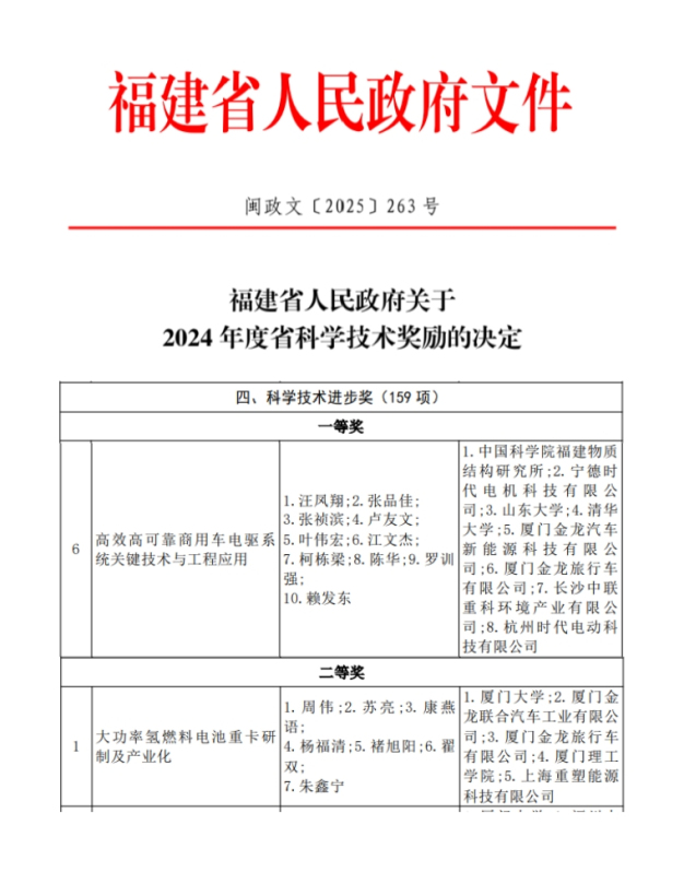 11月28日,2024年度福建省科学技术进步奖获奖名单正式揭晓,金旅客车再获两项大奖。其中,由金旅客车联合清华大学、宁德时代、中科院福建物质结构研究所等机构共同完成的“高效高可靠商用车电驱系统关键技术与工程应用”项目荣获科学技术进步奖一等奖;由金旅客车联合厦门大学、厦门理工等合作完成的“大功率氢燃料电池重卡研制及产业化”荣获科学技术进步奖二等奖。这是金旅在“产学研”领域最新的成果展示,也彰显了金旅科技创新的硬核实力与产业融合的深厚底蕴。